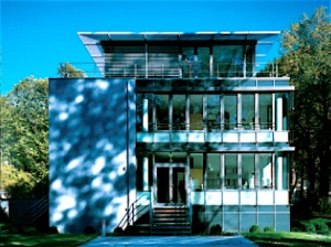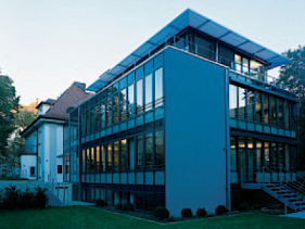 Eine große Herausforderung — ein zeitgemäßes Bürogebäude zu entwerfen, das einen modernen Akzent setzt, ohne zur bestehenden Bausubstanz in Konkurrenz zu treten. Diese Aufgabe verlangte nicht nur architektonisches Fingerspitzengefühl, sondern auch die Einbindung von Experten so unterschiedlicher Disziplinen wie Denkmalschutz, Stadtplanung, Gartenbau und Innenarchitektur. Das Ergebnis: ein zweigeschossiges gläsernes Gebäude mit zurückspringendem Terrassengeschoss, das sich harmonisch an die sanierte Villa anschließt.