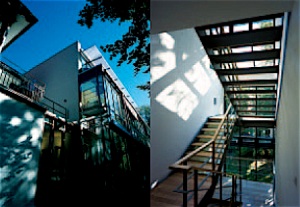 Der Übergang von der Villa in den Bürokomplex, also der Schnittpunkt zwischen Vergangenheit und Moderne, ist gleichzeitig der Eingangsbereich. Mit konzeptioneller Unterstützung der Peter Schmidt Group ist es den Architekten gelungen, eine Verbindung mit Zäsur zu schaffen: Die einzelnen Geschossebenen schließen bündig an der Villa an und nehmen die Traufhöhe des Altbaus auf. Das gläserne Treppenhaus gibt auf dem Weg nach oben den Blick frei auf den Park. Dem Konferenzraum im Dachgeschoss des Neubaus mit seiner umlaufenden Dachterrasse steht auf der Seite des Altbaus eine Gästewohnung im Dachgeschoss der Villa gegenüber.